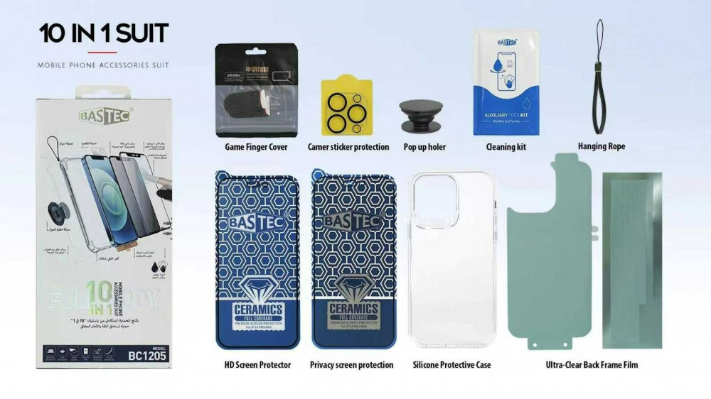 iPhone 14 Pro mobile protection package integrated 10 in 1, consisting of front protection, back protection and thermal wrapping ends - mobile cover - camera protection - installation and cleaning tools - mobile grip - gaming fingers