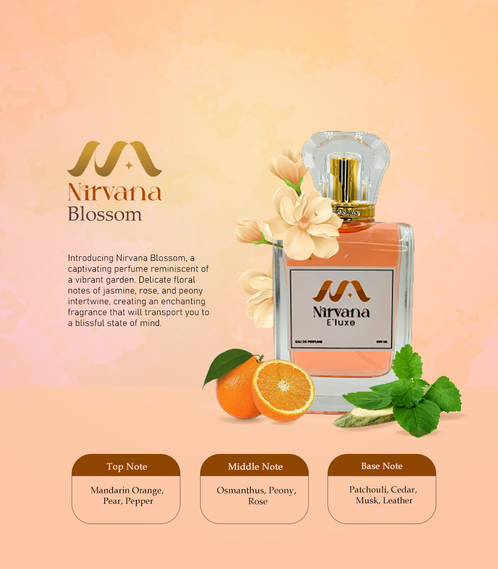 Introducing Nirvana Blossom, a captivating perfume reminiscent of a vibrant garden. Delicate floral notes of jasmine, rose, and peony intertwine, creating an enchanting fragrance that will transport you to a blissful state of mind.