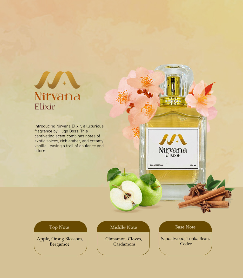 Introducing Nirvana Elixir, a luxurious fragrance by Hugo Boss. This captivating scent combines notes of exotic spices, rich amber, and creamy vanilla, leaving a trail of opulence and allure.