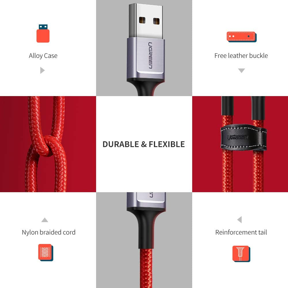 • aster Charge and Sync Cable: UGREEN 3A Type C Cable support QC 3.0 / 2.0 / 1.0 FCP, charging your phones as fast as the original cable. Meanwhile, this USB Charger Cable also supports data syncing speed up to 480Mbps, 1GB files will be transferred in a few seconds