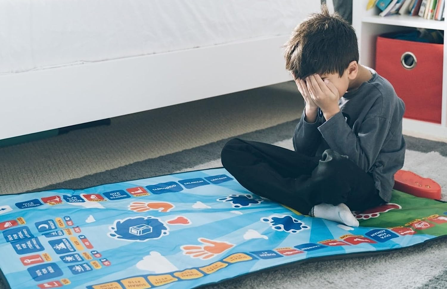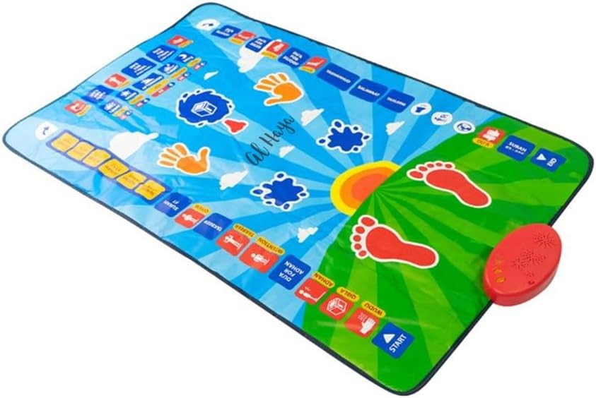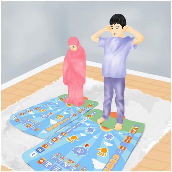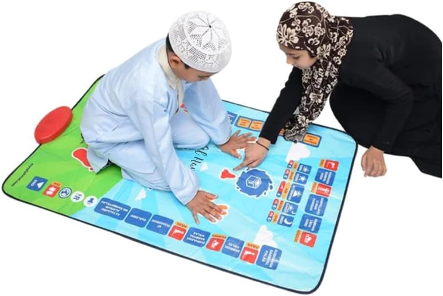 Overviewname: muslim prayer mat Languages: English, French, Arabic, Urdu, Indonesian, Malay, Turkish Product size: 111X70 cm Material: Safe and environmentally friendly ABS, PET film, electronic components Color: purple Battery: 3*1.5V *AA (not included) Product packaging: color box Single package size: 41*30.5*6.8CM Single color box packaging: 0.59KG Packing specification: 24 boxes/carton Outer box specification: 89X34.5X89CM Gross weight: 24.5KG/carton List: 1 x Prayer Mat, 1 x Instruction Manual 1. 7 languages can be switched: English, French, Arabic, Urdu, Indonesian, Malay, Turkish. 2. A total of 41 buttons, learn the process of the whole week. How My Salah Mat Works 1.First,push out the creases in the My Salah Mat with your hands.Each part of the prayer mat is touch-sensitive from the keys around the mat to the positions in prayer (feet,knees,chin,hands and head),so a crease or fold will affect the touch sensitive motion. 2.The prayer mat has been designed to be used by children from age 3 to 10 years;therefore it goes from a very basic level fo understanding of salah to more advanced level for a 10 year old. 3.If the prayer mat is being used by a 3 year old,it may be more suitable for them to be introduced to understanding the positions of the prayer first,that is, where to place the feet,hands head,nose and so on. 4.For a 3 year old,it may not be suitable for them to go through the entire salah as they will not understand this, and they may get bored and leave half way through.It is important not to force them,but to let them learn at their own pace. 5.The prayer mat has been designed as an aid for parents and children to use and help in the performing of salah. We designed an made this prayer nat so that parents would be the first people in their children's lives to teach them salah.Also,so that children will love performing salah and not see it as a boring activity.We hope to help children love salah.