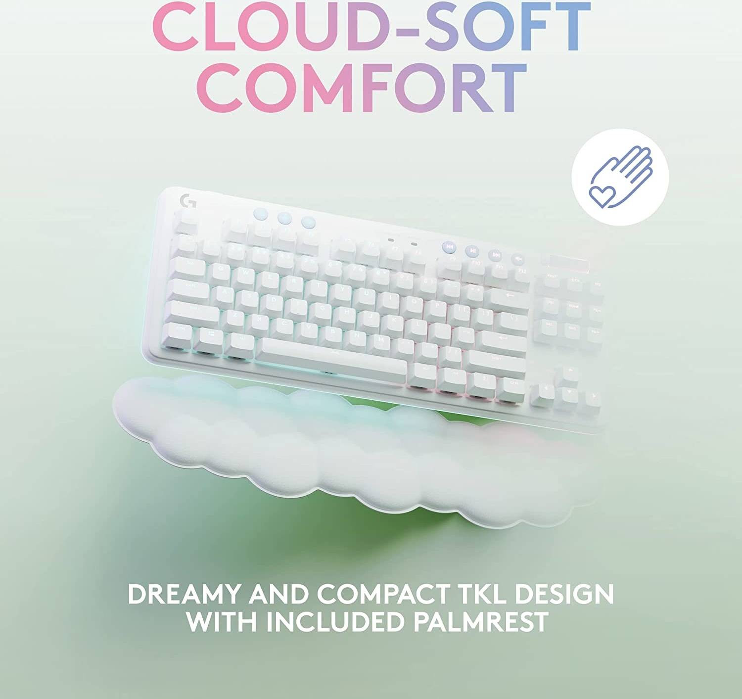 A compact, tenkeyless footprint with adjustable height makes for comfortable all-day play. Cloud-soft palm rest included to complete your dreamy desktop vibes.