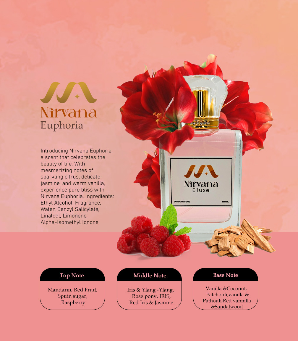 Introducing Nirvana Euphoria, a scent that celebrates the beauty of life. With mesmerizing notes of sparkling citrus, delicate jasmine, and warm vanilla, experience pure bliss with Nirvana Euphoria. Ingredients: Ethyl Alcohol, Fragrance, Water, Benzyl Salicylate, Linalool, Limonene, Alpha-Isomethyl Ionone.