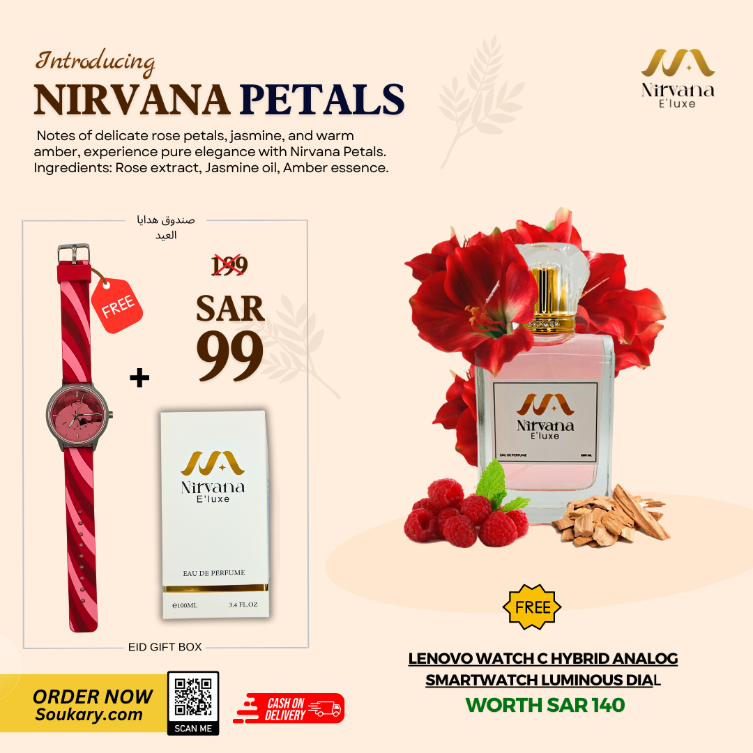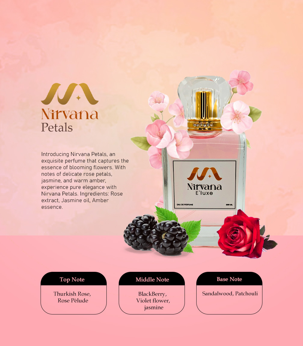 Introducing Nirvana Petals, an exquisite perfume that captures the essence of blooming flowers. With notes of delicate rose petals, jasmine, and warm amber, experience pure elegance with Nirvana Petals. Ingredients: Rose extract, Jasmine oil, Amber essence.
