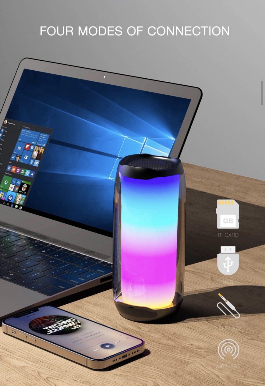 White color amplifier speakers with built-in 360-degree lighting, compatible with all devices